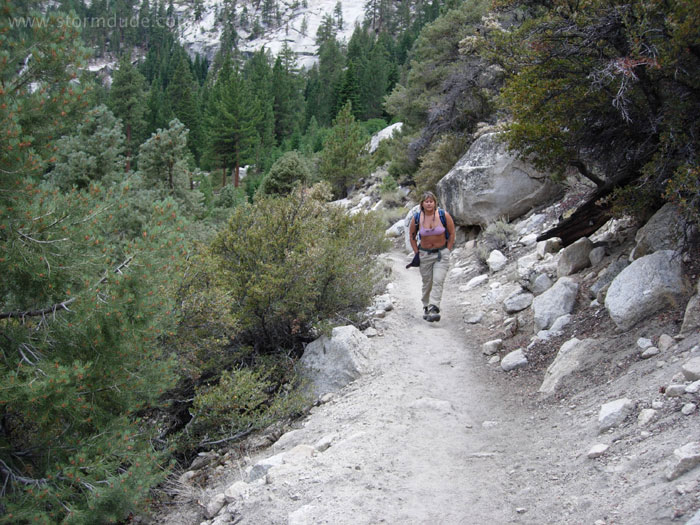 Looking back up the trail as rain clouds thicken over the higher elevations. The first of the backpackers who have summited Mt. Whitney are descending the ridge above us.