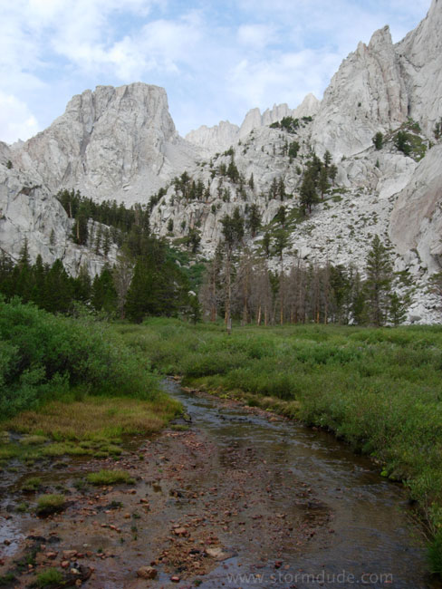 Meadow along Lone Pine Creek, with Mt. Whitney in the background (peak near upper right corner).